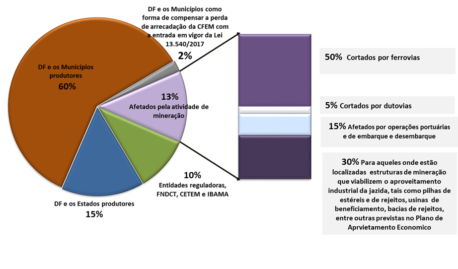 Os atuais critérios de distribuição da CFEM destinam 60% para os municípios produtores, 15% para o Estado, 10% para União e 15% serão destinados aos municípios impactados e afetados pela atividade de mineração.
