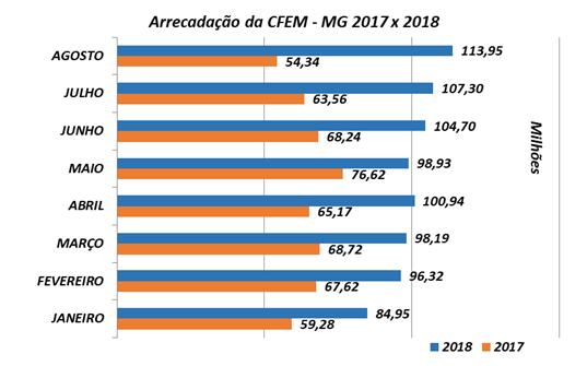 Embora Minas Gerais ainda ocupe o 1° lugar no ranking da CFEM, em agosto 2018, com total de R$113 milhões, o estado do Pará superou os recolhimentos referentes ao mesmo mês atingindo o valor de R$121 milhões, ficando a frente de Minas aproximadamente 7%. De janeiro a agosto deste ano, o Brasil recebeu de CFEM cerca de R$1,842 bilhão ultrapassando o que o país recebeu no ano de 2017 que foi de R$1,837 bilhões.