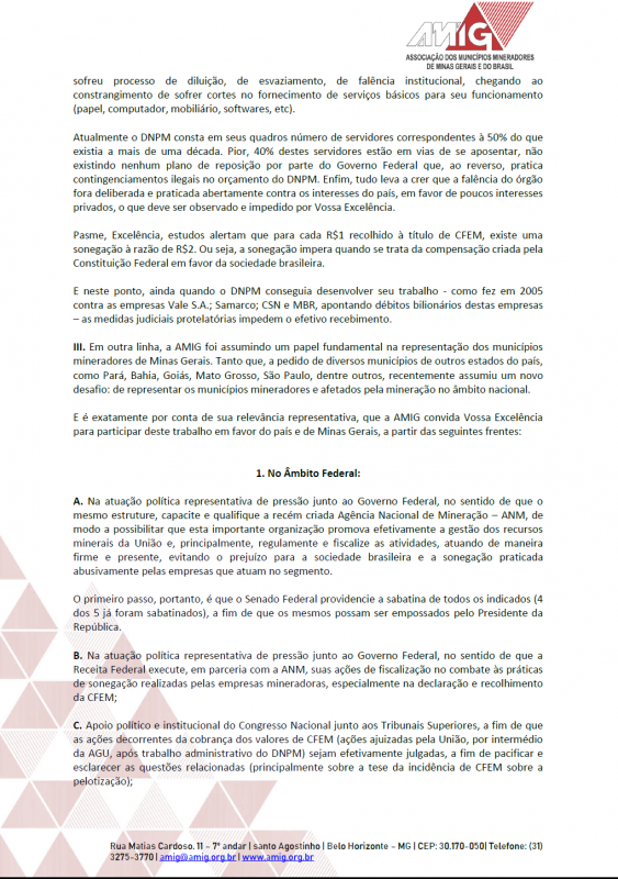 No encontro, que teve como objetivo ampliar o diálogo com os representantes eleitos, foram apresentadas diversas demandas relacionadas a área da mineração e entregue uma carta com solicitações para o setor, dentre elas, a estruturação da Agência Nacional de Mineração (ANM); o apoio no combate à sonegação fiscal, inclusive com parceria da Receita Federal; implantação de comissão para fomento da economia no Estado, além de sugestões para alteração nas leis vigentes do país.