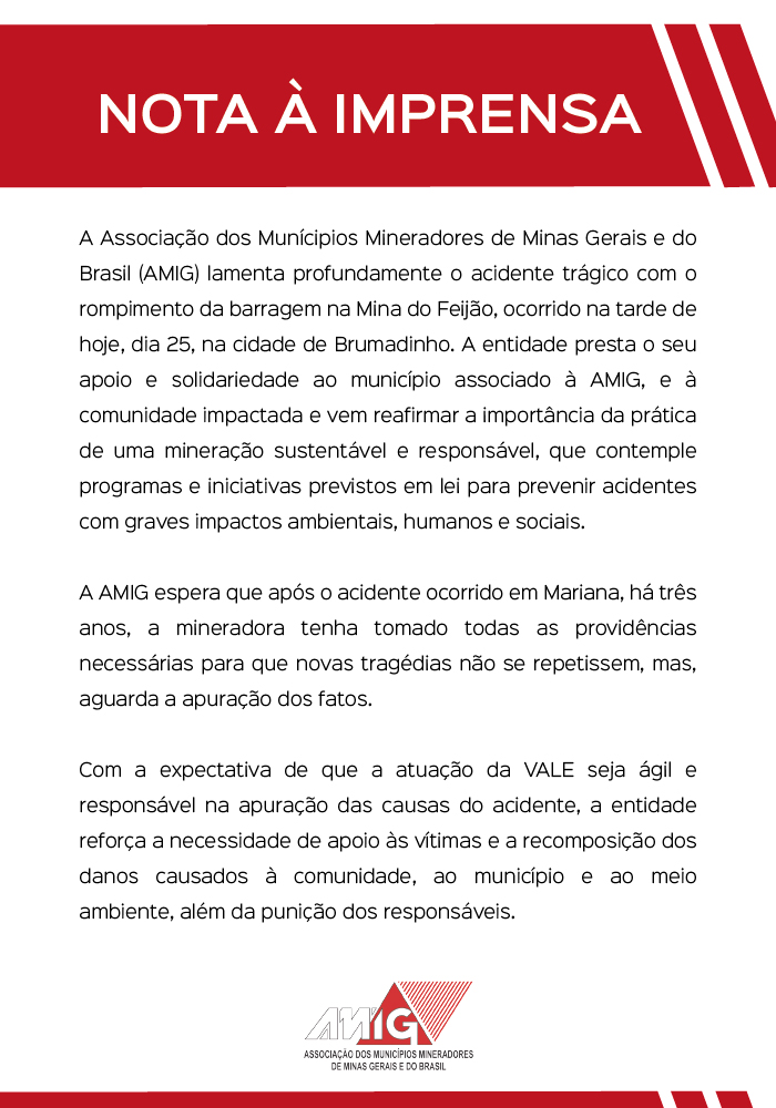 A Associação dos Munícipios Mineradores de Minas Gerais e do Brasil (AMIG) lamenta profundamente o acidente trágico com o rompimento da barragem na Mina do Feijão, ocorrido na tarde de hoje, dia 25, na cidade de Brumadinho. A entidade presta o seu apoio e solidariedade ao município associado à AMIG, e à comunidade impactada e vem reafirmar a importância da prática de uma mineração sustentável e responsável, que contemple programas e iniciativas previstos em lei para prevenir acidentes com graves impactos ambientais, humanos e sociais.