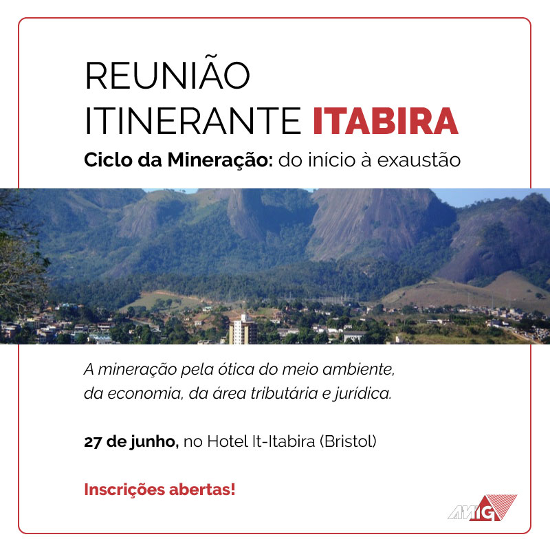 A Associação de Municípios Mineradores de Minas Gerais e do Brasil (AMIG) promove em Itabira, no dia 27 de junho, a Reunião Itinerante. O tema em debate no evento a ser realizado no Hotel It – Itabira (Bristol) será o “Ciclo da Mineração: do início à exaustão”. Minas Gerais e o Brasil têm na mineração um dos principais pilares econômicos: a atividade é fundamental para o desenvolvimento de políticas públicas e valorização do cidadão. No entanto, nos últimos anos alguns fatos provocaram transformações significativas nas relações entre cidades e mineração, e com ela, a necessidade de discutirmos caminhos e alternativas para que cidades, mineração, sociedade e ambiente recebam os melhores resultados e maximizem seu desenvolvimento de forma equilibrada.