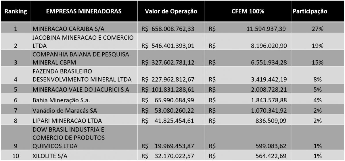 RANKING DAS 10 MAIORES MINERADORAS EM OPERAÇÃO NO ESTADO DA BAHIA