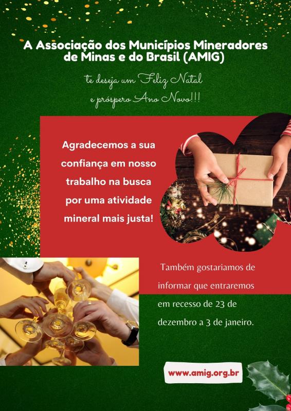 Notícias Desejamos um bom Natal e próspero ano novo Publicações Relacionadas Notícias Regionais 04 . novembro . 2025 AMIG Brasil discute tributação e fiscalização da atividade minerária com representantes de Pains Saiba mais Notícias 08 . outubro . 2025 AMIG Brasil, TCU, TCE-MG e IBRAM cobram reforço na fiscalização da CFEM e reestruturação da Agência Nacional de Mineração Saiba mais Notícias 07 . outubro . 2025 AMIG Brasil apresenta o trabalho realizado pela entidade ao município Corumbá (MS) Saiba mais Notícias 07 . outubro . 2025 AMIG Brasil orienta Volta Redonda sobre enquadramento como município afetado pela mineração Saiba mais