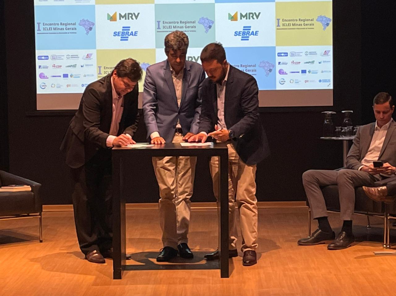 Assinatura do protocolo de intenções. Da esquerda à direita: Rodrigo Perpétuo, secretário executivo do ICLEI; José Fernando Aparecido de Oliveira, presidente da AMIG e prefeito de Conceição do Mato Dentro; João Marcelo Dieguez, diretor administrativo da AMIG e diretor administrativo.