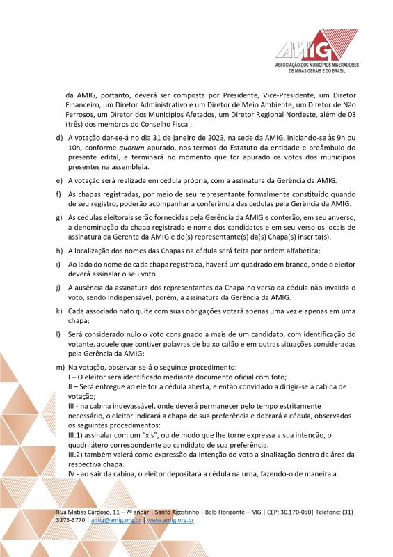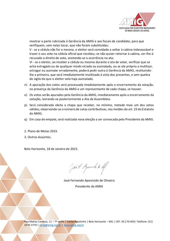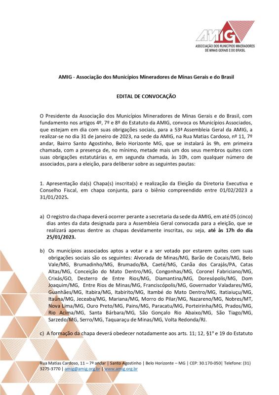 Notícias Edital de convocação para a 53ª Assembleia Geral Publicações Relacionadas Notícias Regionais 04 . novembro . 2025 AMIG Brasil discute tributação e fiscalização da atividade minerária com representantes de Pains Saiba mais Notícias 08 . outubro . 2025 AMIG Brasil, TCU, TCE-MG e IBRAM cobram reforço na fiscalização da CFEM e reestruturação da Agência Nacional de Mineração Saiba mais Notícias 07 . outubro . 2025 AMIG Brasil apresenta o trabalho realizado pela entidade ao município Corumbá (MS) Saiba mais Notícias 07 . outubro . 2025 AMIG Brasil orienta Volta Redonda sobre enquadramento como município afetado pela mineração Saiba mais