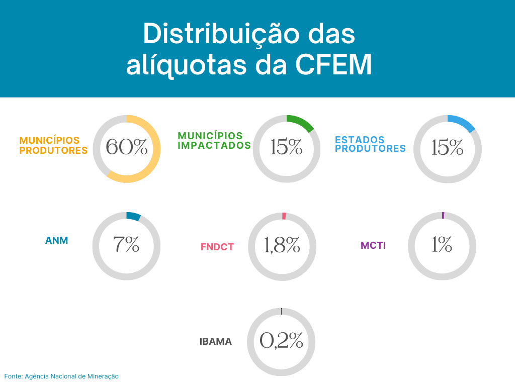 Outra alteração fundamental, foi a inclusão dos municípios afetados pela atividade de mineração no rol de beneficiados pela CFEM. Esta inclusão resultou na redistribuição do recurso, que ficou da seguinte forma: 60% para municípios produtores, 15% aos estados produtores, 15% para os municípios impactados, 7% para a Agência Nacional de Mineração (ANM), 1,8% para os Ministérios de Ciência, Tecnologia, Inovação e comunicações (MCTI), 1% ao Fundo Nacional de Desenvolvimento Ciência e Tecnologia (FNDCT) e 0,2% para o Instituto Brasileiro de Meio Ambiente e dos Recursos Naturais Renováveis (IBAMA).