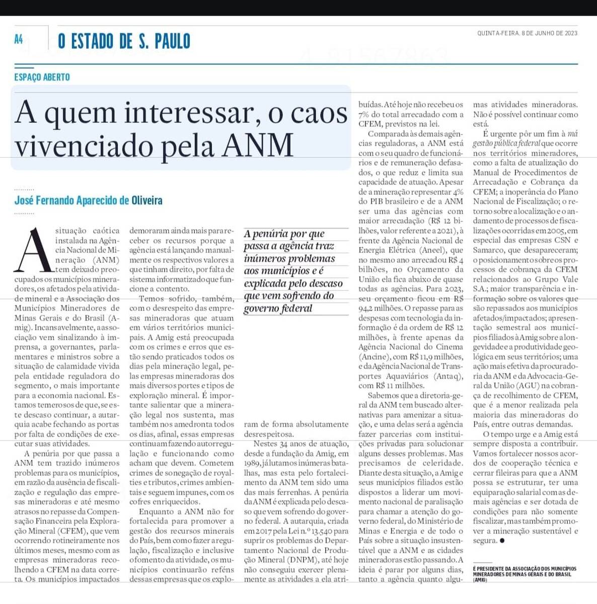 A situação caótica instalada na Agência Nacional de Mineração (ANM) tem deixado preocupados os municípios mineradores, os afetados pela atividade mineral e a Associação dos Municípios Mineradores de Minas Gerais e do Brasil (AMIG). Incansavelmente, a associação vem sinalizando à imprensa, governantes, parlamentares e ministros sobre a situação de calamidade vivida pela entidade reguladora do segmento mais importante para a economia nacional. Estamos temerosos de que, se esse descaso continuar, a autarquia acabe fechando as portas por falta de condições de executar suas atividades.